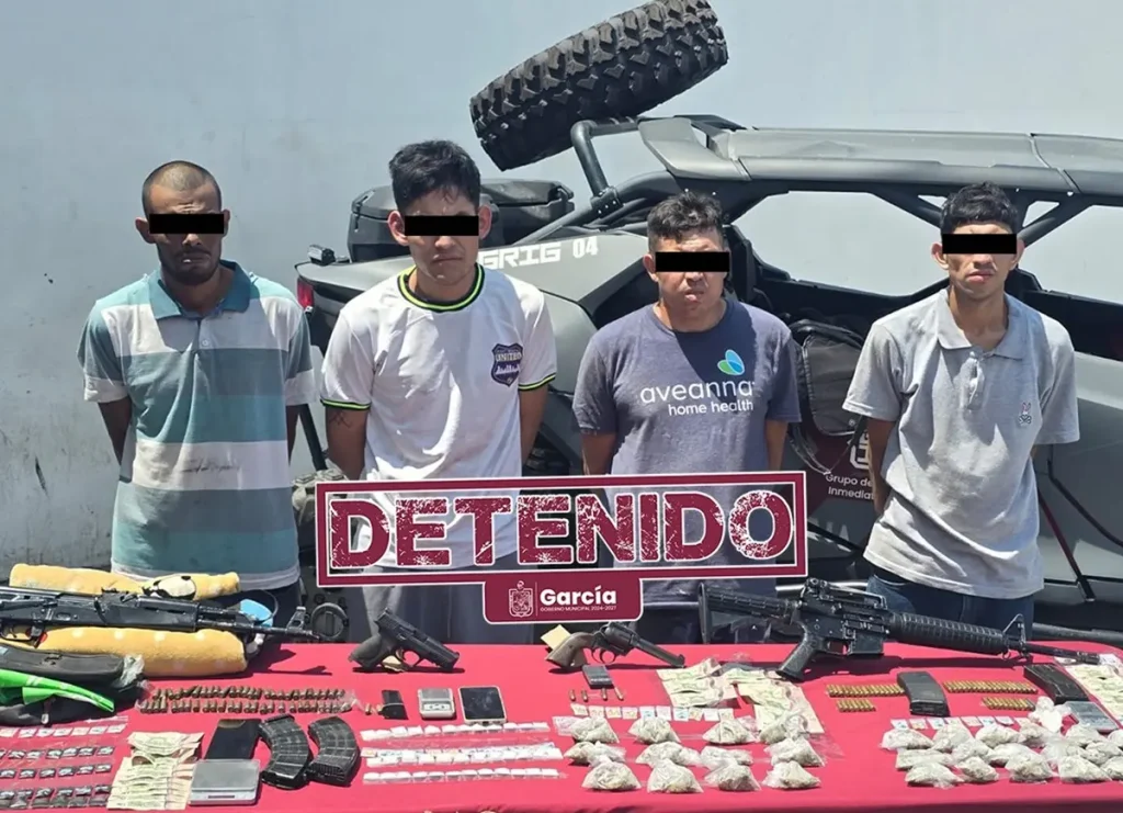 En un operativo realizado en la colonia Héroes de Capellanía, la Policía Municipal de García logró la detención de cuatro presuntos generadores de violencia, así como el decomiso de un arsenal y diversos tipos de droga, en un importante golpe al crimen organizado en el municipio.