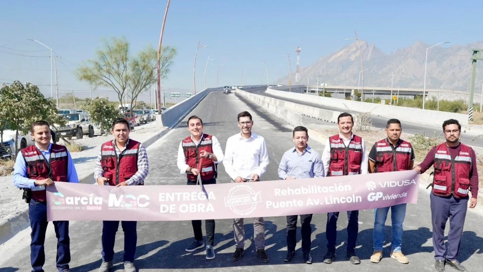 El alcalde de García, Manuel Guerra Cavazos, encabezó la entrega del puente rehabilitado de Avenida Lincoln, una obra que transforma la movilidad de García y devuelve la seguridad a miles de familias de las colonias Vista Bella, Portal de Lincoln y Real de Lincoln.